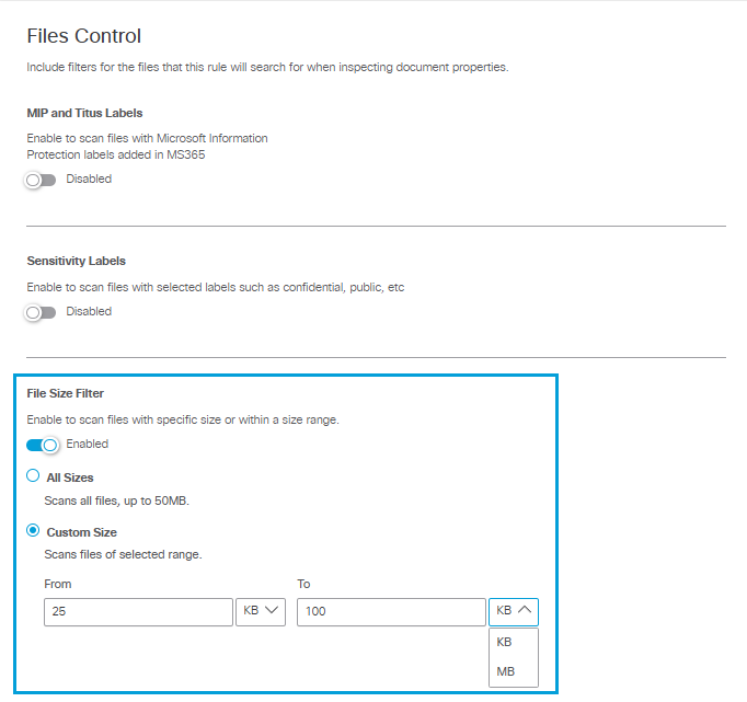 For all platforms you can select file size filter criteria. The DLP applies the rule action to files that match the other criteria, within the file size specified up to the first 50 MB of plain text. (Umbrella does not scan file content beyond the first 50 MB regardless of the file size specified here.)