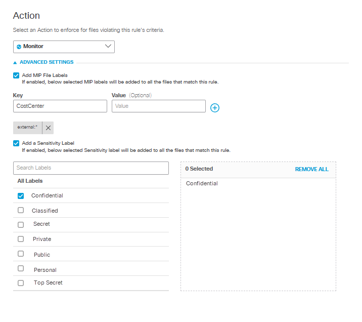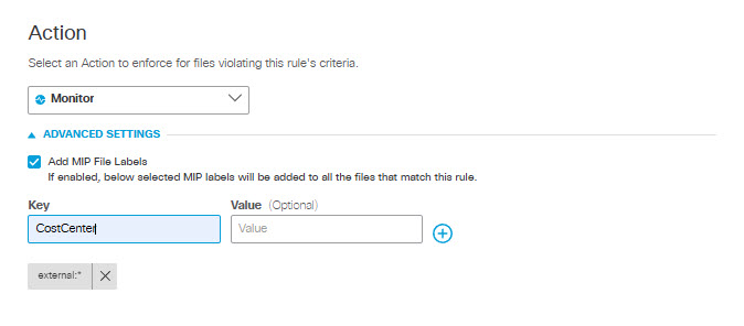 - You can specify MIP file labels that Umbrella will apply to files that match the rule. Enter the key (and optionally the value) for each label to be applied.