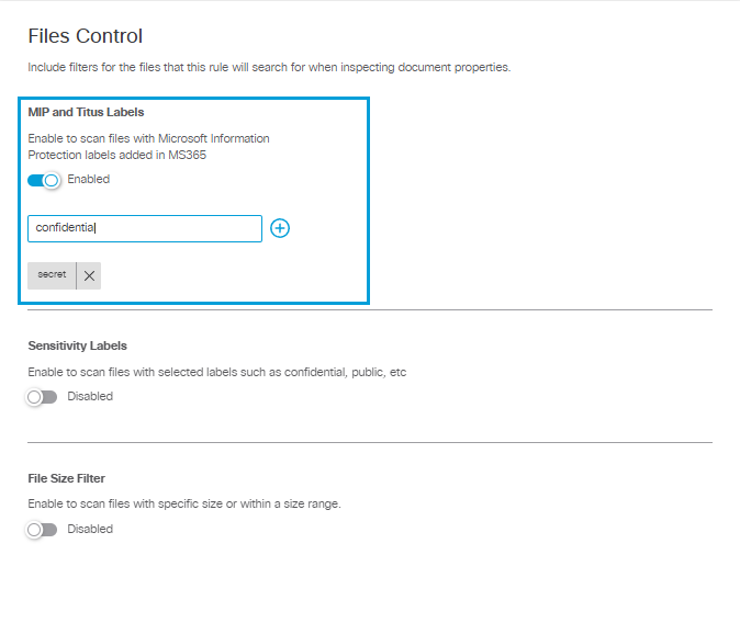 - For AWS S3, Azure Storage, Dropbox, Google Drive, ServiceNow, Slack, and Webex Teams you can apply filters for MIP and Titus labels, and file size.