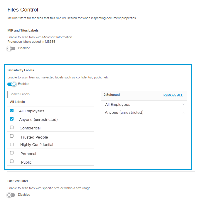 - For Microsoft 365 and Box you can apply filters for MIP and Titus labels, sensitivity labels, and file size. (Within the Box application, sensitivity labels are referred to as classification labels.)