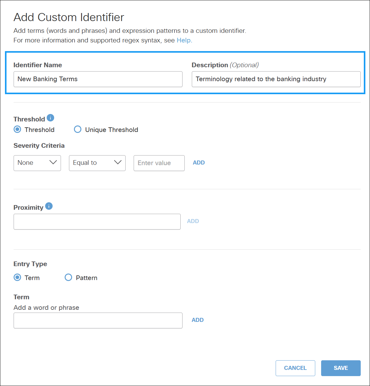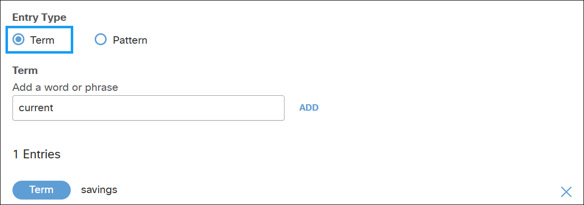 Note: Terms and patterns cannot be uploaded or entered as a CSV. Each term must be entered individually.a. For Term, add up to 100 terms and click ADD for each term.