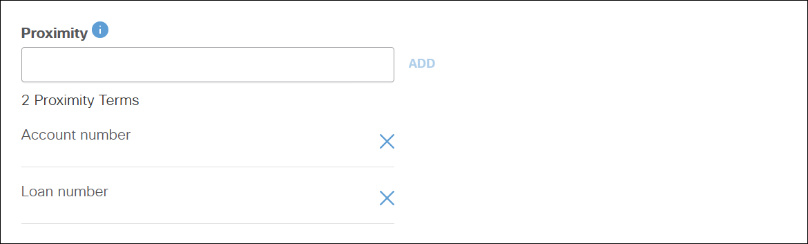 (Optional) Specify a proximity keyword and then click ADD. You can repeat this step to add up to 10 proximity keywords for your custom identifier. If you specify proximity keywords, Umbrella will not generate an incident unless at least one of the occurrences of a matching term or pattern appears within 20 terms of a proximity keyword.