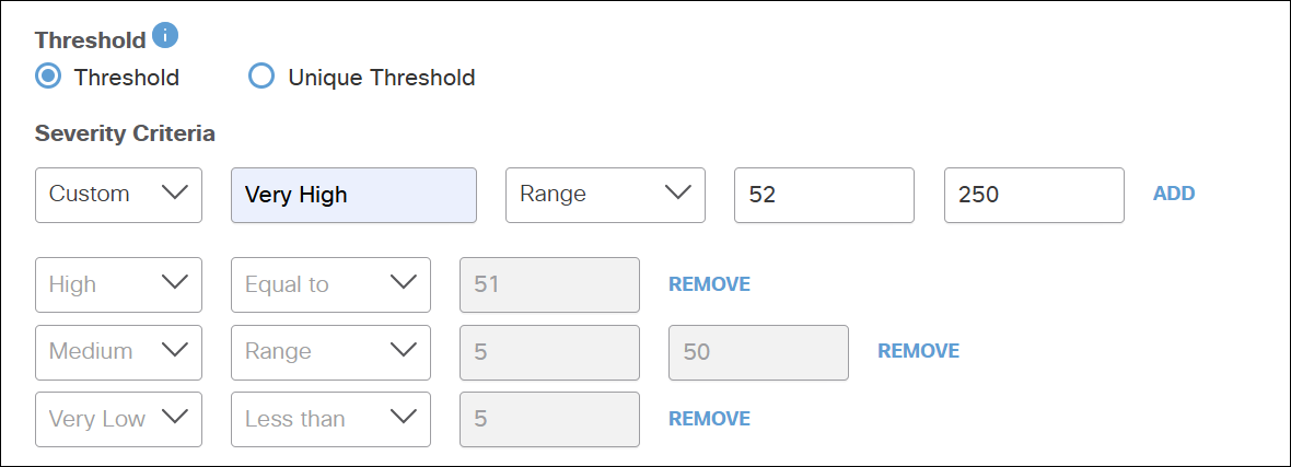 - (Optional) Select Threshold or Unique Threshold and then specify the Severity Criteria. The Threshold value represents the total number of occurrences of this identifier that must be detected in a document for Umbrella to generate an incident. The Unique Threshold value represents the number of unique occurrences of this identifier that must be detected in a document for Umbrella to generate an incident. A threshold of 3, for example, only generates an incident if 3 instances of the identifier are found in the file. The default threshold is 1.