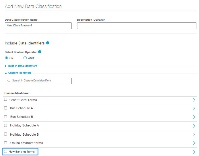 Once you create a custom identifier, you can add it to a data classification. To create a data classification, see Create a Data Classification or Copy and Customize a Built-In Data Classification.