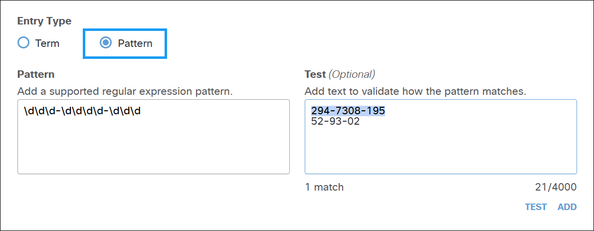 After adding a regular expression, you can enter sample text in the Test box, and click TEST to verify the pattern matches.